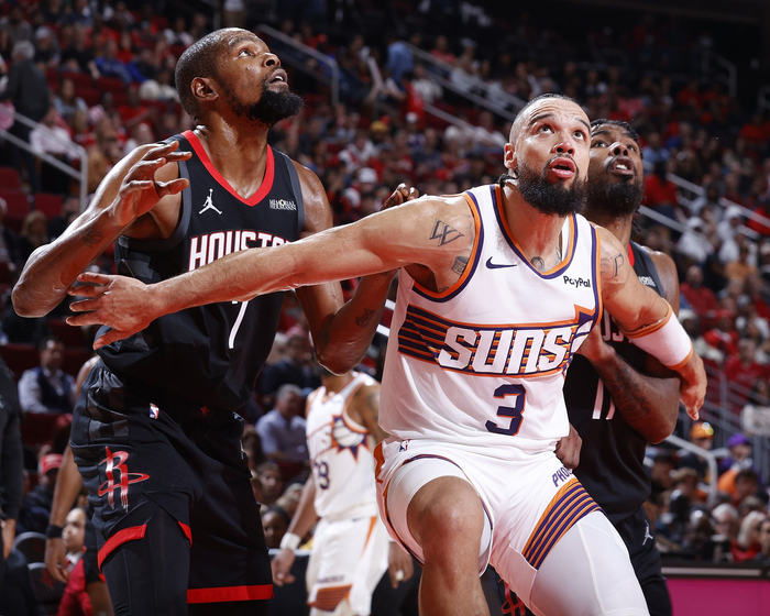 太阳是标准的一大四小阵容,有马威和伊戈达罗两个足尺寸的5号位,但4号位却是201公分的狄龙和198公分的奥尼尔,外围则是191公分的古德温、193公分的格林、196公分的布克、191公分的阿伦、185公分的吉莱斯皮,火箭的二、三高度都有明显的篮板优势,投抢打法简单粗暴。