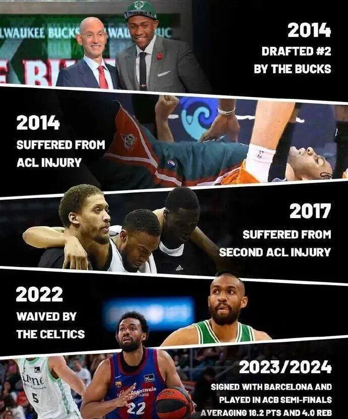 NBA生涯8年,辗转雄鹿、公牛、奇才、老鹰、国王、凯尔特人,场均14.1分5.5篮板2助攻。2021-22赛季后,无人问津。如今在西甲的尤文图特队打球,左膝盖上两道手术疤痕,像两条蜈蚣。